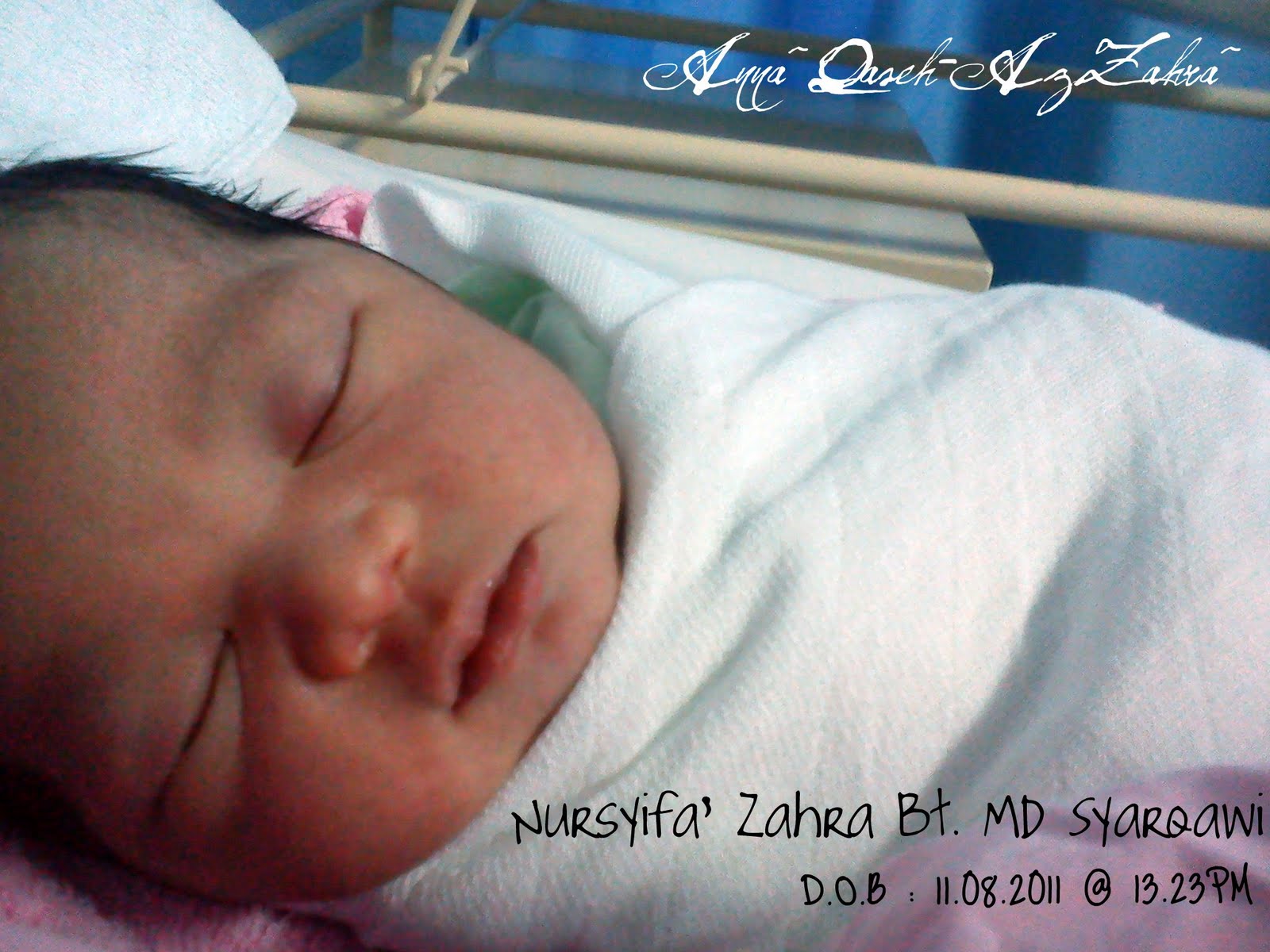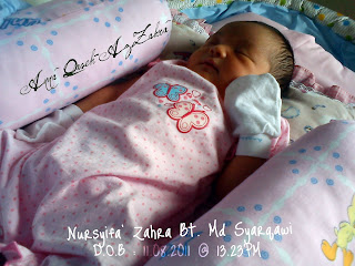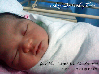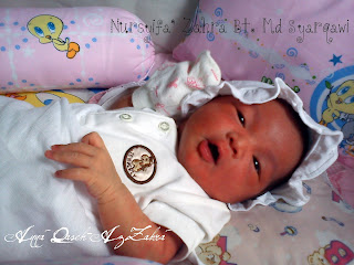 NURSYIFA' ZAHRA nama diberi, semoga dirimu menjadi penawar buat kami di dunia & syafaat buat kami di akhirat kelak. Syifa' dilahirkan jam 1.23pm hari Khamis dgn berat 3.03kg di Hospital Selayang. Lahirnya disambut seorang doktor wanita yang cantik manis tanpa apa-apa komplikasi.