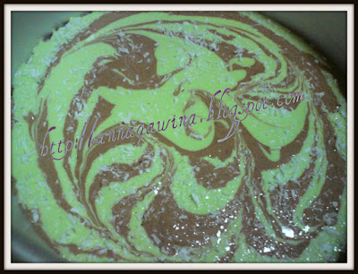 - Masukkan adunan hijau & coklat berselang seli ke dalam loyang yg dah digris. **Ana tabur sedikit kelapa kering setiap lapisan