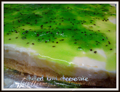 Intai2 dalam petiais nampak ada buah kiwi, terfikir nak buat muffin kiwi ke puding kiwi? Yelah ada orang tu tayang puding kiwinya kemain hijau mata memandang lagi kan...uhuks...Kucekalkan hati, buat jem/filling kiwi untuk dijadikan salah 1 bahan sampingan utama kek ni..resepi filling/jem tu kat MyResipi.Com, olah dari resepi Delila..Jem strawberry