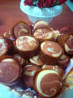 **Untuk buat corak kat atas muffin tu, ambil sedikit adunan, campurkan dengan sedikit emulco coklat, gaul sebati sehingga rata, sudukan sedikit ke atas adunan muffin yang warna plain tu, ambik lidi/chopstick, pusing2 ikut suka le..ala2 marble gitu..